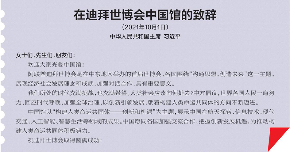 南都讯 2020年迪拜世博会10月1日在阿联酋迪拜开幕,名为“华夏之光”的中国馆当日举行开馆仪式,正式迎接观众。国家主席习近平为中国馆作视频致辞。