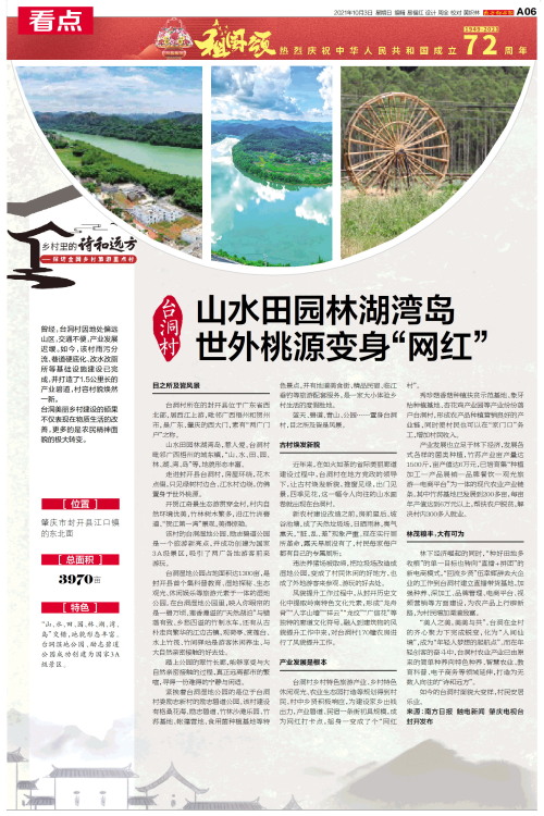 山水田园林湖湾岛,惹人爱。台洞村毗邻广西梧州的城东镇,“山、水、田、园、林、湖、湾、岛”等,地貌形态丰富。