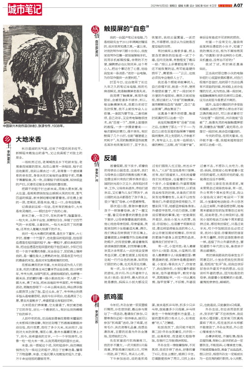 乡土 李晓/重庆 秋日温润的天气里,迎来了中国农民丰收节。新鲜稻米散发出的香气,又让我涌起了对故土的思念。 一场秋雨过后,老周喊我去乡下吃新米饭。老周是我城里的朋友,他在山里有一块稻田。稻子