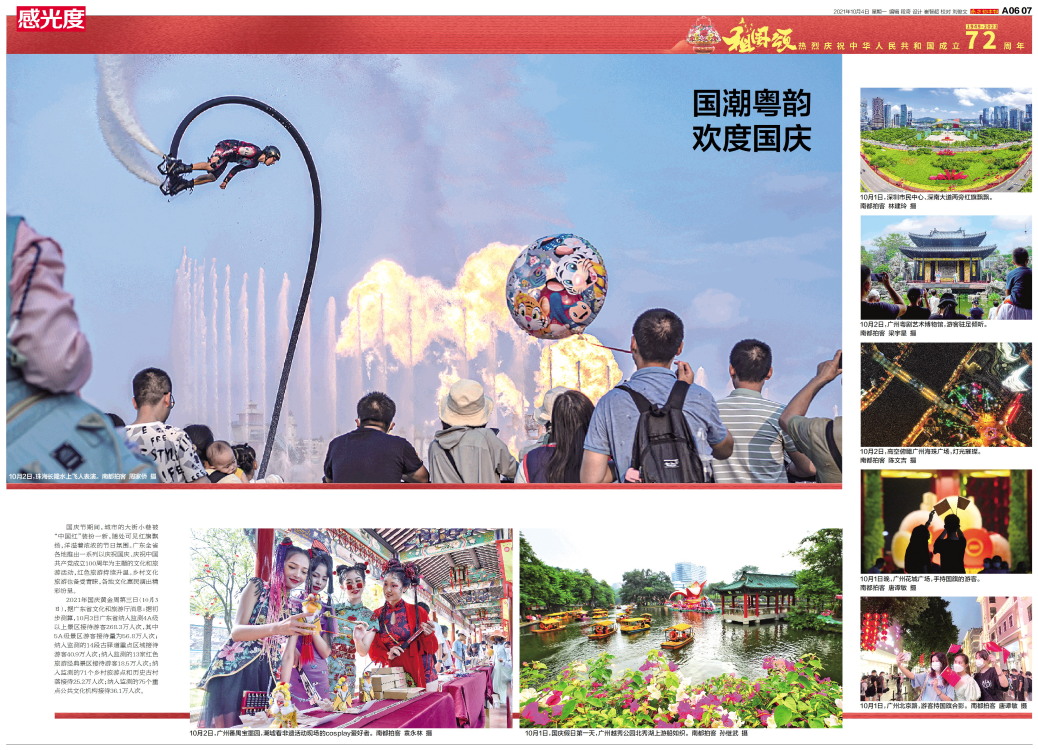 国庆节期间,城市的大街小巷被“中国红”装扮一新,随处可见红旗飘扬,洋溢着浓浓的节日氛围。广东全省各地推出一系列以庆祝国庆、庆祝中国共产党成立100周年为主题的文化和旅游活动,红色旅游持续升温。乡村