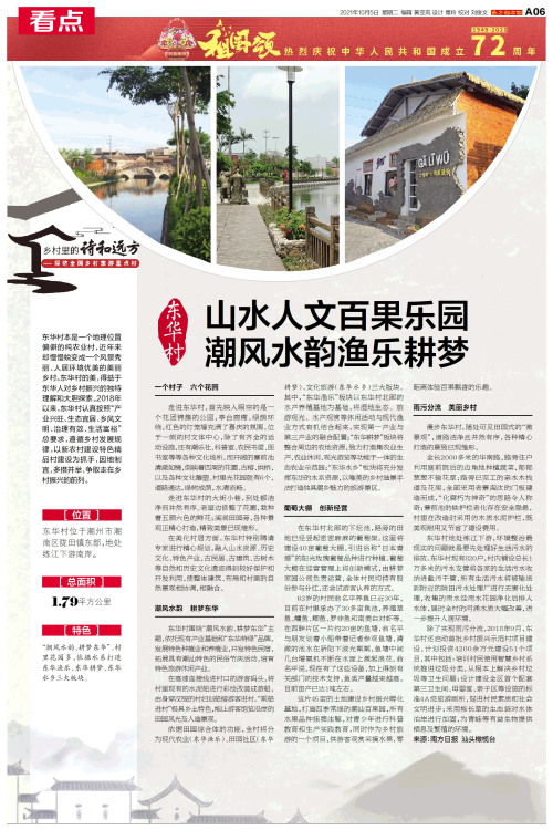 “潮风水韵、耕梦东华”。村里花园多,依据水系打造东华渔乐、东华耕梦、东华水乡三大板块。