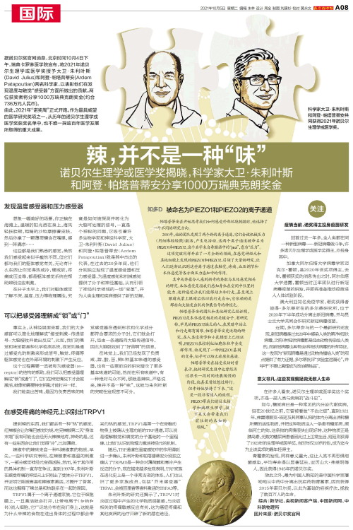 据诺贝尔奖官网消息,北京时间10月4日下午,瑞典卡罗琳医学院宣布,将2021年诺贝尔生理学或医学奖授予大卫·朱利叶斯(David Julius)和阿登·帕塔普蒂安(Ardem Patapoutia