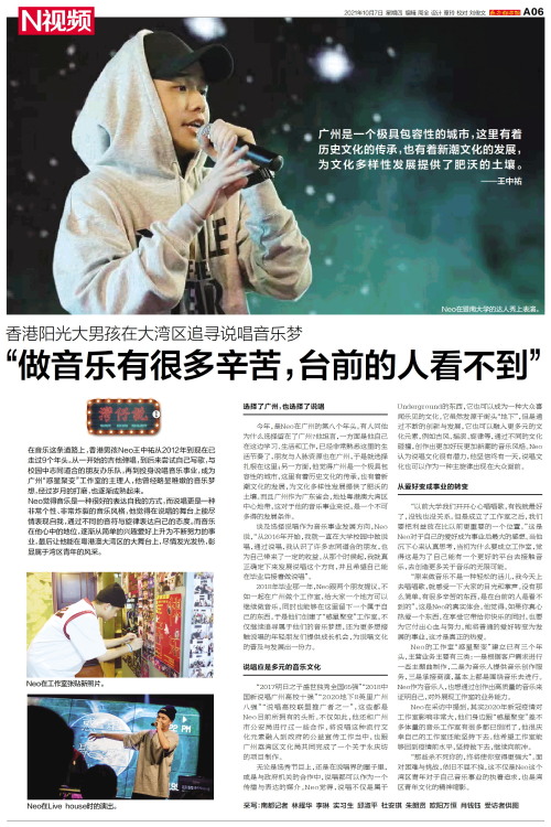 广州是一个极具包容性的城市,这里有着历史文化的传承,也有着新潮文化的发展,为文化多样性发展提供了肥沃的土壤。 ——王中祐 在音乐这条道路上,香港男孩Neo王中祐从2012年到现在已走过9个年头。