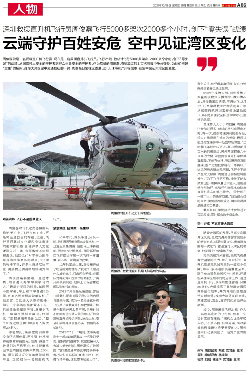 周俊磊曾是一名舰载直升机飞行员,现在是一名救援直升机飞行员。飞行21载,他总计飞行5000多架次,2000多个小时,创下“零失误”的战绩。从国家领土安全的守护者到群众生命安全的守护者,作为党员的周