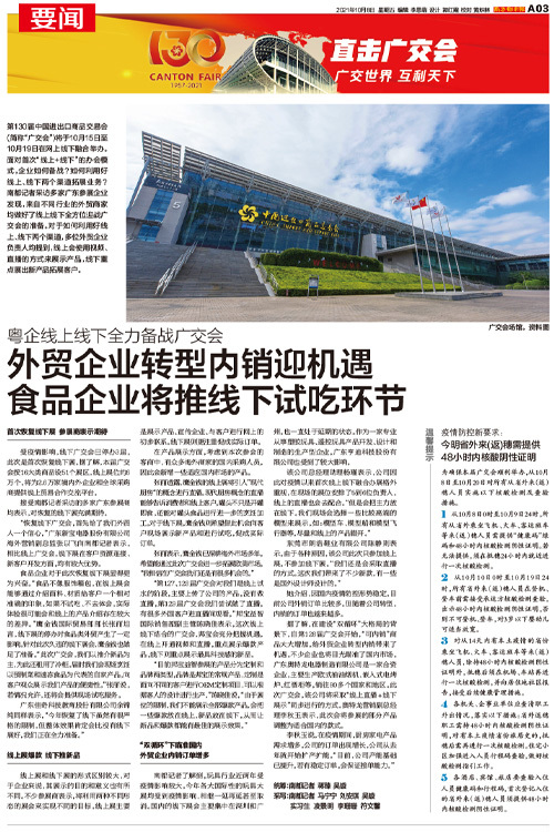 广交会场馆。 资料图 第130届中国进出口商品交易会(简称“广交会”)将于10月15日至10月19日在网上线下融合举办。面对首次“线上+线下”的办会模式,企业如何备战