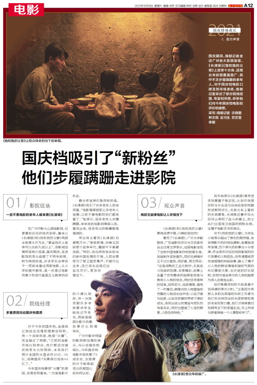 2021国庆档炼成记之 各方声音 国庆期间,南都记者走访广州各大影院发现,《长津湖》《我和我的父辈》上座率十分高,且观众年龄层覆盖面广,其中不乏步履蹒跚的老年人。对于国庆档电影口碑及其市场表现,