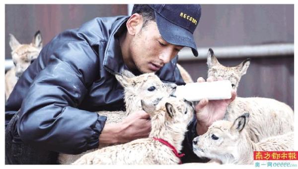 可可西里国家级自然保护区卓乃湖保护站,工作人员才文多杰在给藏羚羊幼仔喂奶。 新华社发