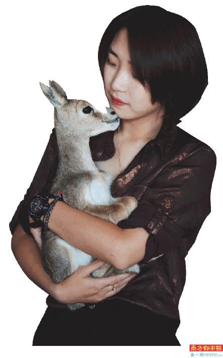 初雯雯抱着从小失去妈妈的鹅喉羚宝宝。 受访者供图