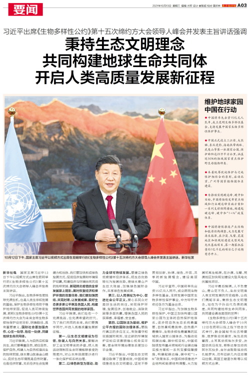 10月12日下午,国家主席习近平以视频方式出席在昆明举行的《生物多样性公约》第十五次缔约方大会领导人峰会并发表主旨讲话。 新华社发 新华社电 国家主席习近平12日下午以