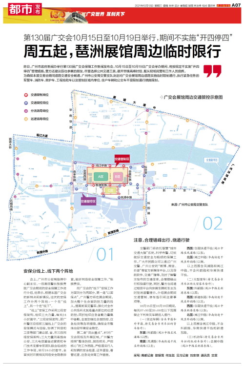 昨日,广州市政府新闻办举行第130届广交会保障工作新闻发布会。10月15日至10月19日广交会举办期间,将按规定不实施“开四停四”管理措施。警方还建议前往参展的朋友,尽量选择公共交通工具,避开早晚