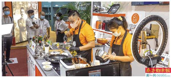厨具参展商在展位现场直播用自家厨具做菜。 南都记者 谭庆驹 摄