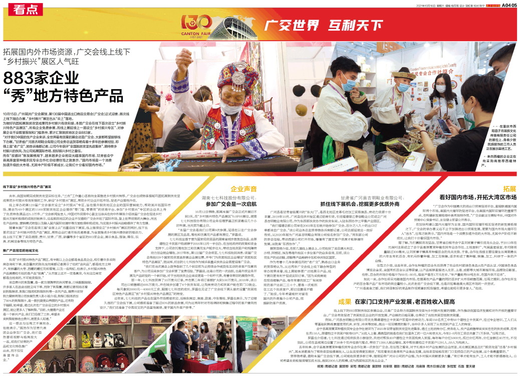 10月15日,广州琶洲广交会展馆,第130届中国进出口商品交易会(广交会)正式迎客,首次线上线下融合办展,“乡村振兴”展区也从“云上”落地。为做好巩固拓展脱贫攻坚成果同乡村振兴有效衔接,本届广交会