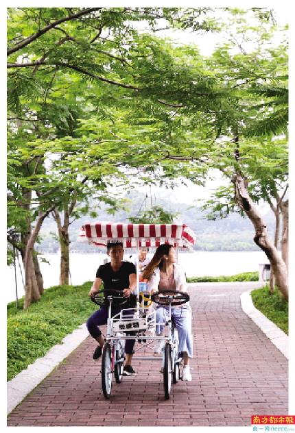 在肇庆星湖绿道中心湖段,两名年轻人骑着单车游玩。 南都记者 黎湛均 摄
