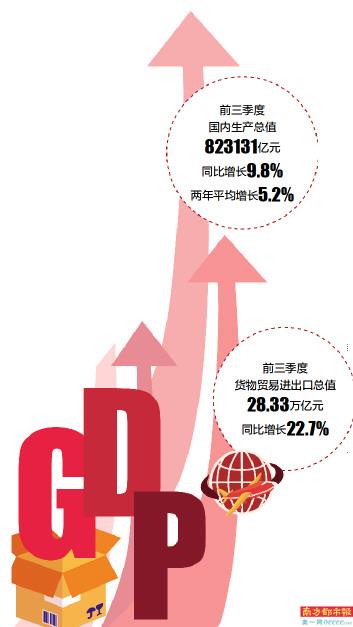 据国家统计局数据,前三季度国内生产总值823131亿元,按可比价格计算,同比增长9.8%,两年平均增长5.2%,比上半年两年平均增速回落0.1个百分点。