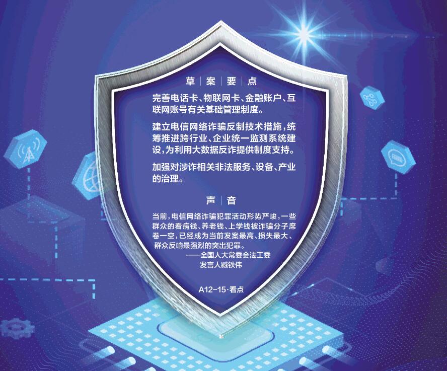 建立电信网络诈骗反制技术措施,统筹推进跨行业、企业统一监测系统建设,为利用大数据反诈提供制度支持。