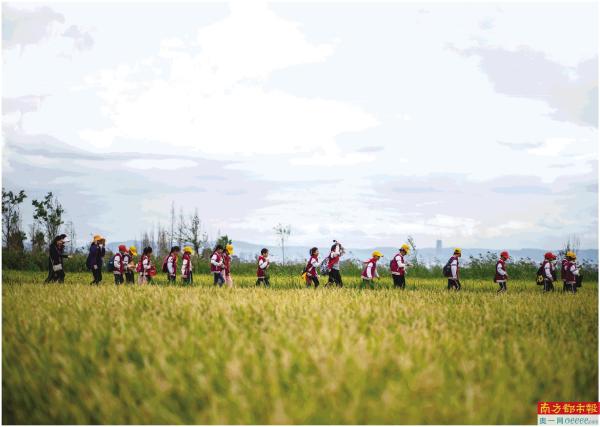 师生们在昆明市宝丰半岛湿地的麦田间穿行。 新华社发
