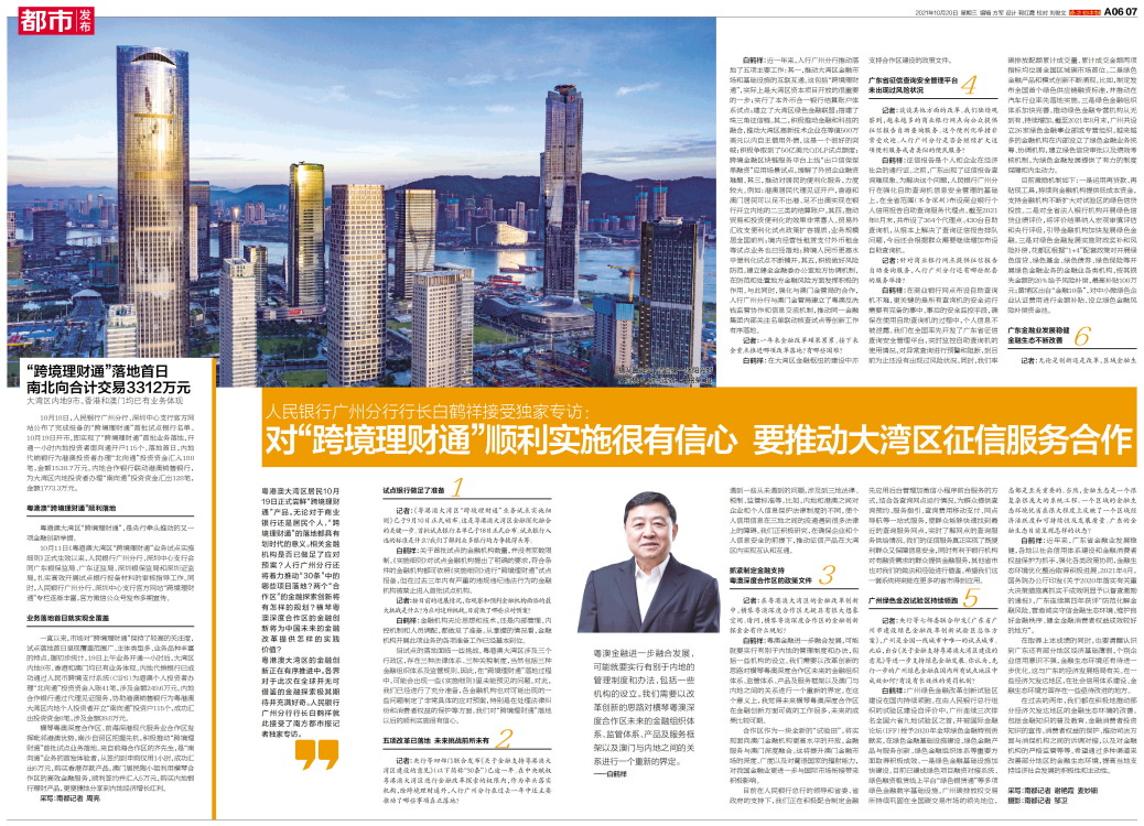 粤港澳大湾区居民10月19日正式尝鲜“跨境理财通”产品。无论对于商业银行还是居民个人,“跨境理财通”的落地都具有划时代的意义。相关金融机构是否已做足了应对预案?人行广州分行还将着力推动“30条”中
