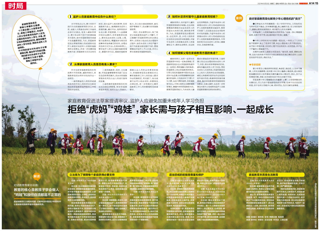 家庭教育促进法草案三审稿昨日提请十三届全国人大常委会审议。草案三审稿指出,未成年人的父母或者其他监护人应当合理安排未成年人学习、休息、娱乐和体育锻炼的时间,避免加重未成年人学习负担、预防未成年人沉