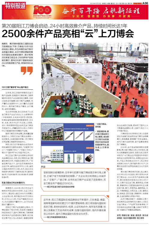 南都讯 第20届中国(阳江)国际五金刀剪博览会(下称:刀博会)10月19日启动线上展会。作为中国五金刀剪行业的最大展会,此次刀博会借助阿里巴巴国际站搭建云展厅,预计将有200多家刀剪企业、2500
