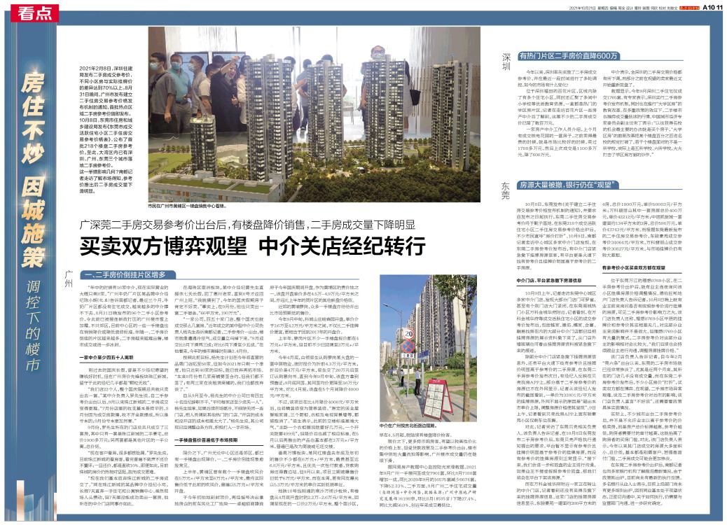 市民在广州市黄埔区一楼盘销售中心看楼。 中介在广州悦吉北街路边摆摊。 2021年2月8日,深圳住建局发布二手房成交参考价,不同小区房与实际挂牌价的
