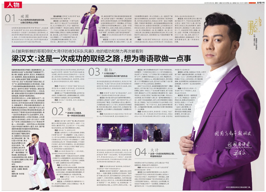在《乐队风暴》的录制后台,梁汉文接受了南都记者专访,他期待在大湾区迎来自己事业的第二春:“我们是大湾仔嘛,事业有成当然要在大湾区发光发热。”他还用曾出演《齐天大圣孙悟空》中“唐僧”一角自我鼓励:“回到这里,我觉得这是一次成功的取西经之路,很高兴让大家可以重新认识我,希望可以继续进步。”