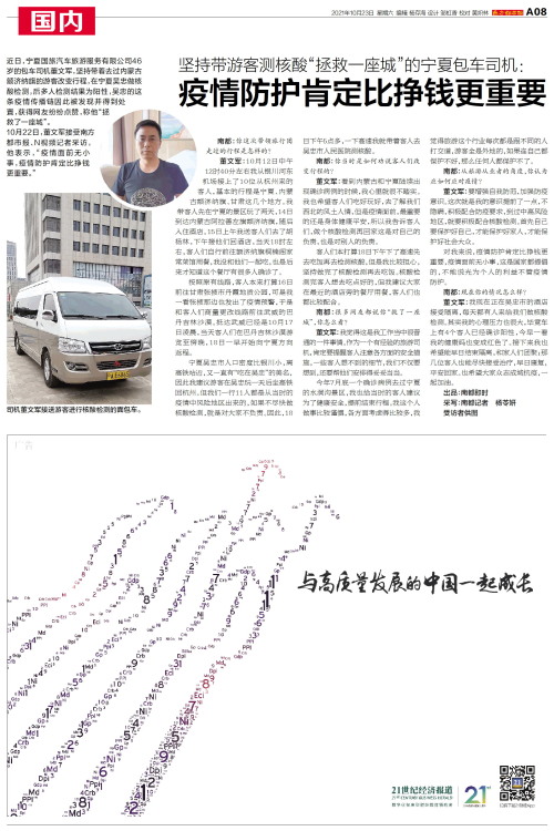 近日,宁夏国旅汽车旅游服务有限公司46岁的包车司机董文军,坚持带着去过内蒙古额济纳旗的游客改变行程,在宁夏吴忠做核酸检测,后多人检测结果为阳性,吴忠的这条疫情传播链因此被发现并得到处置,获得网友纷