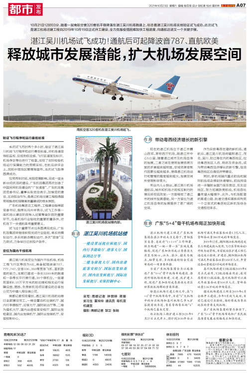10月21日12时03分,随着一架南航空客320客机平稳降落在湛江吴川机场跑道上,标志着湛江吴川机场实地验证试飞成功。此次试飞是湛江机场迁建工程自2019年10月19日正式开工建设,全力克服疫情困
