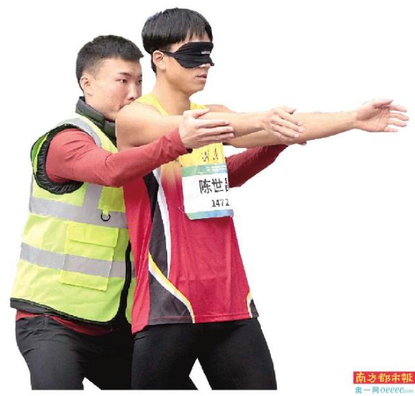 10月23日,在田径男子跳远T11级决赛中,工作人员帮助选手对准跑道。IC图片