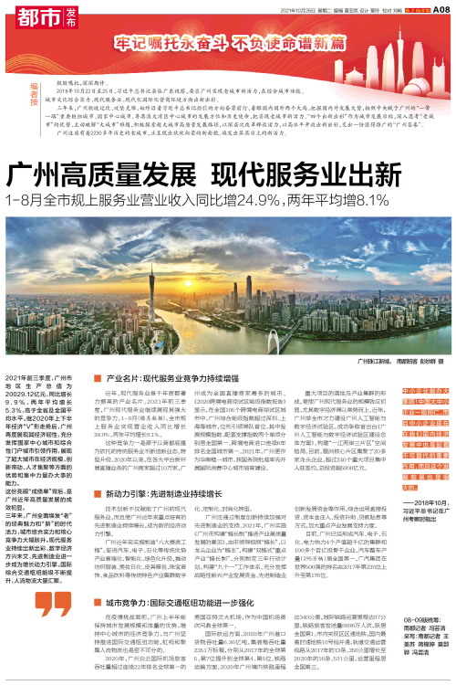 编者按 殷殷嘱托,深深期许。 2018年10月22日至25日,习近平总书记亲临广东视察,要求广州实现老城市新活力,在综合城市功能、城市文化综合实力、现代服务业、现代化国际化营商环境方面出新出彩