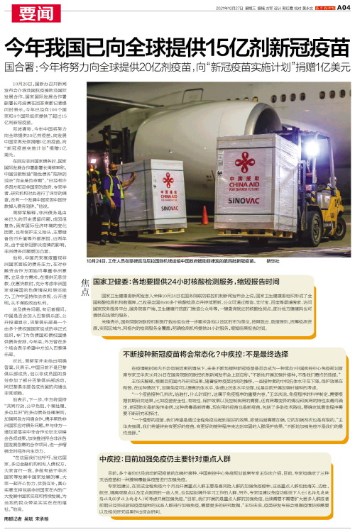 10月26日,国新办召开新闻发布会介绍我国抗疫援助及国际发展合作。国家国际发展合作署副署长邓波清在回答南都记者提问时表示,今年已经向106个国家和4个国际组织提供了超过15亿剂新冠疫苗。 邓波清