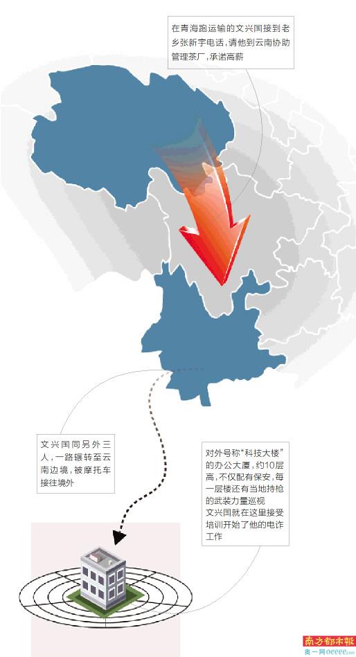 文兴国(化名)是第一次踏足这片土地,在此之前,他对边境之外一无所知。几天前,他接到老乡张新宇(化名)的电话,对方声称云南有个茶厂,请他到云南协助管理,一个月少说一万块,交通食宿全包,文兴国此前跑运输,每个月六七千元的收入,在青海已算得上高收入,但货车司机是个苦差事,他动了挣快钱的念头,决定从西宁飞往昆明。