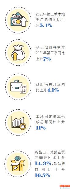 按本地生产总值各个主要组成部分分析,私人消费开支在2021年第三季同比上升7%。政府消费开支同比上升4.1%。本地固定资本形成总额同比上升11%。货品出口总额在第三季也同比上升14.3%,货品进口同比上升16.5%。