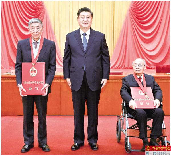 11月3日,2020年度国家科学技术奖励大会在北京人民大会堂隆重举行。中共中央总书记、国家主席、中央军委主席习近平向获得2020年度国家最高科学技术奖的中国航空工业集团有限公司顾诵芬院士(右)和清华大学王大中院士(左)颁奖。 新华社发