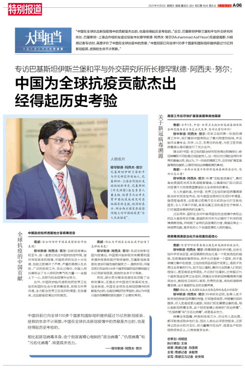 人物名片 穆罕默德·阿西夫·努尔 巴基斯坦伊斯兰堡和平与外交研究所创始人、巴基斯坦-上海合作组织友谊论坛秘书长、巴基斯坦《外交洞察》杂志负责人兼主编。他曾多次公开点赞中国抗疫成效及对其他国家的