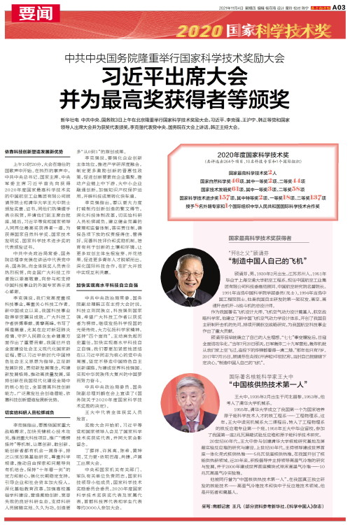 新华社电 中共中央、国务院3日上午在北京隆重举行国家科学技术奖励大会。习近平、李克强、王沪宁、韩正等党和国家领导人出席大会并为获奖代表颁奖。李克强代表党中央、国务院在大会上讲话。韩正主持大会。