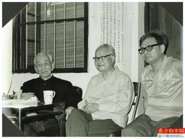 上世纪八十年代,沈从文(中)来广州编《沈从文全集》,苏晨(右)邀请他与中大著名教授容庚来家会面。
