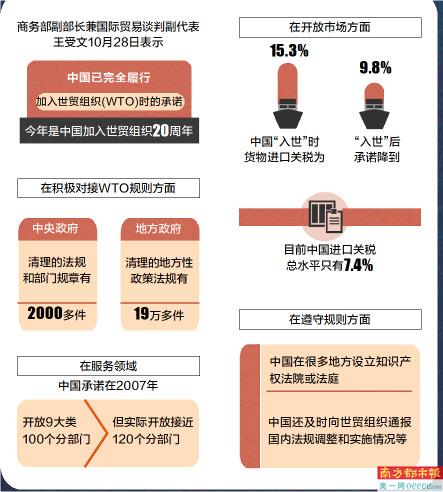 在开放市场方面,中国“入世”时货物进口关税为15.3%,承诺“入世”后降到9.8%,而目前中国进口关税总水平只有7.4%,“低于所有发展中成员,接近发达成员水平”。