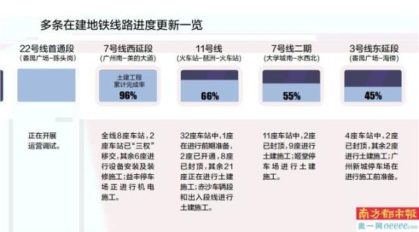 南都讯 日前,广州地铁发布在建线路截至10月底的“进度条”。南都记者梳理发现,继18号线9月底实现开通运营后,其“姐妹线”22号线首通段(番禺广场-陈头岗)日前正在开展运营调试。备受关注的广佛第二条“牵手”地铁线路7号线西延段(广州南-美的大道)土建工程累计已完成96%,进度条快拉满,全力冲刺年内开通。