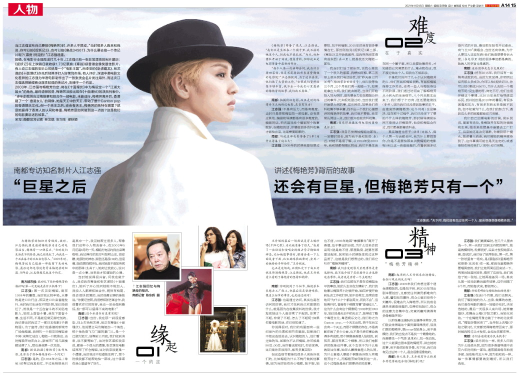 与梅艳芳的相识非常偶然,彼时,江志强托朋友邀请梅艳芳为自己的电影站台,梅艳芳一口便答应。“当时我们生活在不同阶层,她已经很红了,而我是一个正在奋斗的不知名电影人。”2003年时,梅艳芳说自己想拍一部能留下来的电影,最后这部电影没有等来梅艳芳的加盟。18年后,江志强想完成这个约定。