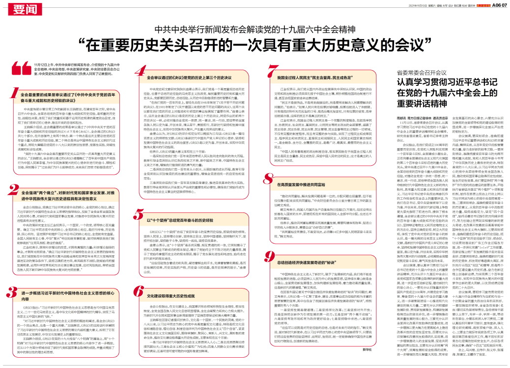 11月12日上午,中共中央举行新闻发布会,介绍党的十九届六中全会精神,中央宣传部、中央政策研究室、中央财经委员会办公室、中央党史和文献研究院四部门负责人回答了记者提问。 1 全会最重要的成果是