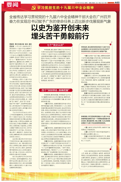 南都讯 南方日报记者 徐林 通讯员岳宗 11月15日,全省传达学习贯彻党的十九届六中全会精神干部大会在广州召开。会议认真学习贯彻习近平总书记在党的十九届六中全会上的重要讲话精神和全会精神,结合学习