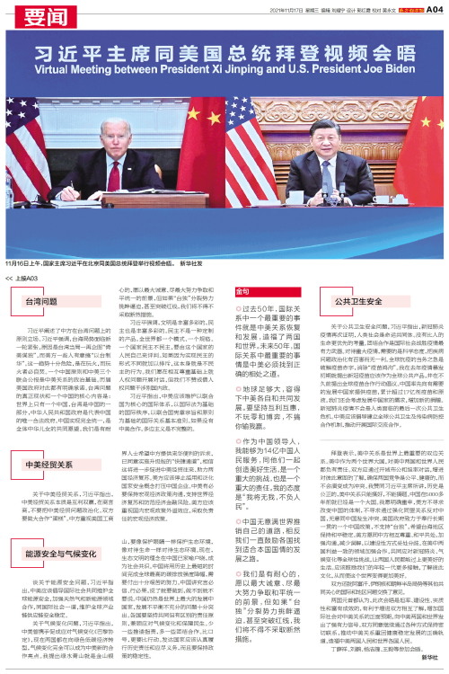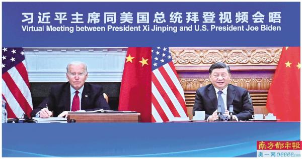 国家主席习近平11月16日上午同美国总统拜登举行视频会晤。双方就事关中美关系发展的战略性、全局性、根本性问题以及共同关心的重要问题进行了充分、深入的沟通和交流。