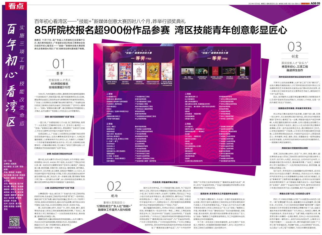 南都讯 11月17日,由广东省人力资源和社会保障厅主办、南方都市报承办、广东省职业培训和技工教育协会协办的百年初心看湾区——“技能+”新媒体创意大赛颁奖典礼在粤港澳大湾区(广东)创新创业孵化基地落
