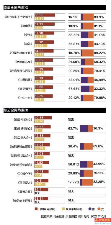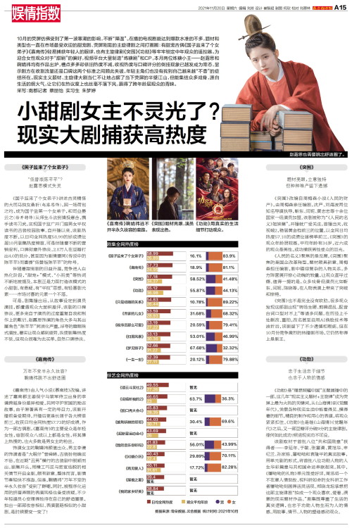 10月的荧屏仿佛受到了第一波寒潮的影响,不断“降温”。在播的电视剧能达到爆款水准的不多,题材和类型也一直在市场最受欢迎的甜宠剧、荧屏刚需的主旋律剧之间打圈圈:有甜宠古偶《国子监来了个女弟子》《嘉南传》轻易捕获年轻人的眼球,也有主旋律剧《突围》《功勋》等牢牢锁定中年观众的遥控器。为迎合女性观众对于“甜剧”的偏好,视频平台大量制造“炼糖剧”和CP,本月两位炼糖小主——赵露思和鞠婧祎均有作品出炉,槽点多多却依旧热度不减,收视热度与口碑评分的倒挂现象已越发成为常态,显示剧方在收割流量还是口碑这两个标准之间顾此失彼,年轻主角们也没有找到自己越来越“不香”的症结所在。现实主义题材、主旋律大剧当仁不让地占据了当下荧屏的半壁江山,但能集结众多戏骨,源自生活的烟火气,让它们在热议度上也丝毫不落下风,赢得了跨年龄层观众的青睐。