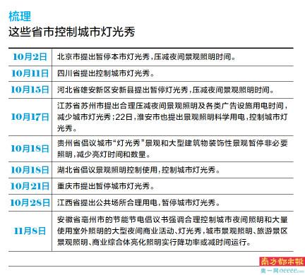 而在节能限电大背景下,广州并不是唯一对灯光秀活动作出限制的城市。南都记者观察到,最近一两个月以来,已陆续有至少10省市提出限制和减少灯光秀。重启的时间则待定。