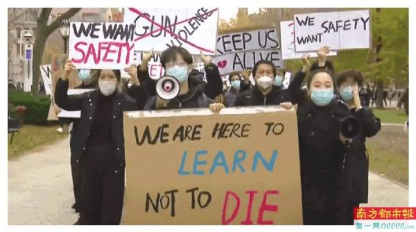 11月16日,芝大学生和家长们举着自制的标牌,喊着口号游行示威,“我们来这里是为求学,不是送死。”另有超过300名芝大教职员工签署公开信对郑少雄的遇难表示惊惧,呼吁校方将打击暴力作为首要任务。
