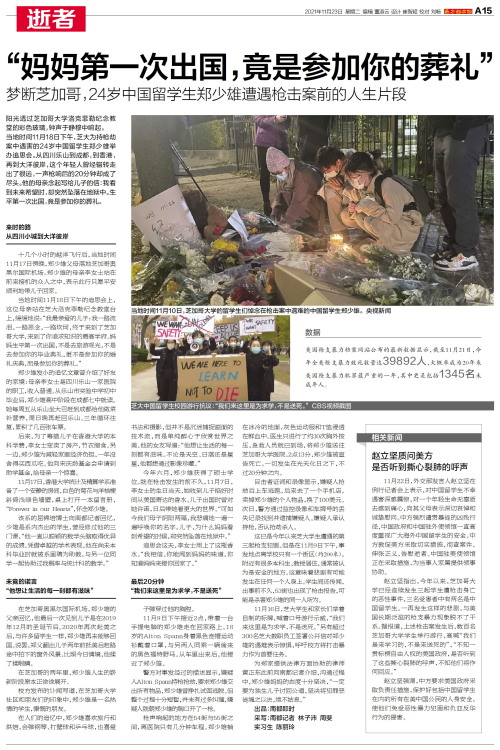 阳光透过芝加哥大学洛克菲勒纪念教堂的彩色玻璃,钟声于静穆中响起。当地时间11月18日下午,芝大为持枪劫案中遇害的24岁中国留学生郑少雄举办追思会。从四川乐山到成都,到香港,再到大洋彼岸,这个年轻人
