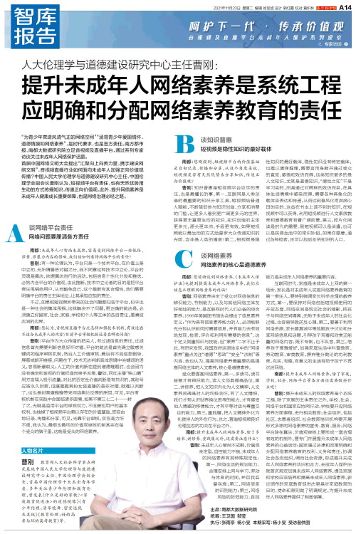 “为青少年营造风清气正的网络空间”“涵育青少年爱国情怀、道德情操和网络素养”,是时代要求,也是各方责任。南方都市报、南都大数据研究院立足音视频及直播平台,通过系列专家访谈关注未成年人网络保护话题。