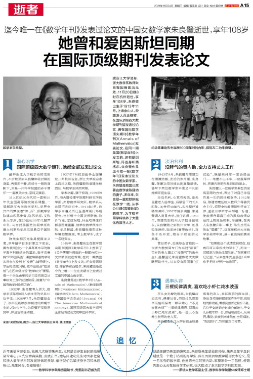 据浙江大学消息,浙大数学系教师朱良璧因病医治无效,11月20日晚8时在杭州逝世,享年108岁。朱良璧出生于1913年11月,上海金山人。曾随浙大西迁辗转,在国际顶级四大数学期刊皆发表过论文,曾在国