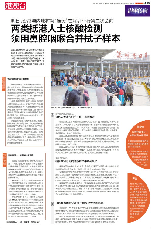 昨日,香港特区行政长官林郑月娥出席行政会议前见记者时表示,22日已收到国务院港澳办通知,香港与内地将于11月25日在深圳就“通关”举行第二次会议,进一步商讨两地“通关”细节。南都记者获悉,特区政府